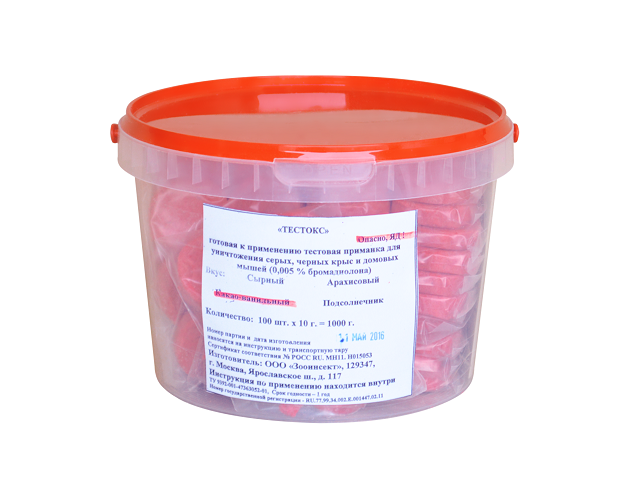 Родентицидное средство "Тестокс" - это готовая к применению пищевая приманка в виде тестовых лепешек или таблеток красного цвета. Содержит в качестве действующего вещества (ДВ) бромадиолон- 0.005%, а также битрекс (горький компонент), предохраняющий приманки от поедания птицами и снижающий опасность случайного отравления людей и не целевых видов животных, краситель и пищевые наполнители. Средство обладает высокой родентицидной активностью для крыс и мышей: поедаемость приманки составляет: 41,8% от суточного рациона крыс и 36,9% - мышей. Гибель крыс и мышей составляла 100 и 90% соответственно наступала на 4-9 день (6,2 дн. в среднем) крыс и на 5-13 день (7,7 дн в среднем) - мышей. Средство предназначено для уничтожения крыс (серых, черных) и домовых мышей на объектах различных категорий: в жилых и нежилых строениях, подземных сооружениях, подвалах, погребах, канализационной сети, а также в подсобных помещениях пищевых, детских (в местах, не доступных для детей) и лечебных учреждений персоналом организаций, имеющих право заниматься дезинфекционной деятельностью, и населением в быту.