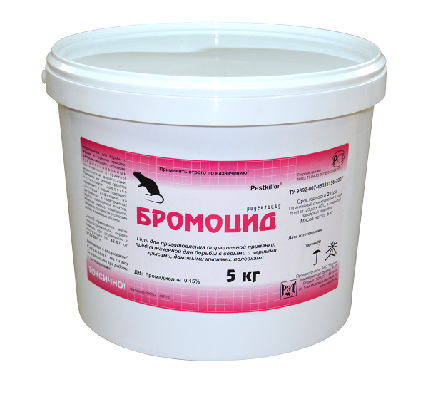 Средство родентицидное «БРОМОЦИД» (далее - средство) представляет собой концентрат в форме геля, окрашенного в красный цвет, содержащий в качестве действующего вещества (ДВ) бромадиолон в количестве 0,15%. Средство предназначено для приготовления отравленных приманок с целью борьбы с домовыми мышами, черными и серыми крысами, полевками профессиональным контингентом в практике медицинской дератизации. Средство применяют в очагах природно-очаговых инфекций, на застроенных и незастроенных частях населенных пунктов, включая жилые помещения, пищевые, детские ( в отсутствие детей) и лечебные объекты.