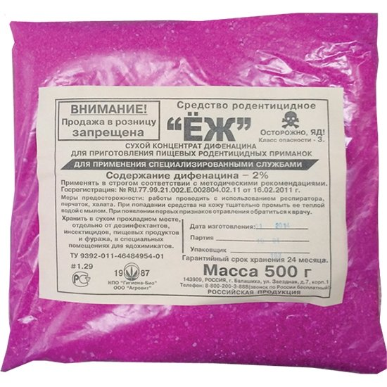 Родентицидное средство «ЁЖ» представляет собой концентрат в форме крупнодисперсного порошка, розового (или голубого) цвета, который содержит в качестве действующего вещества 2% дифенацина. В состав концентрата входят также преобразующий компонент, аттрактивные вещества, краситель. Срок хранения - 1 год.