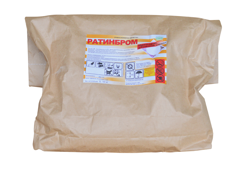 Родентицидный концентрат "Ратинбром" представля­ет собой порошок яркого розово-красного цвета благодаря наличию красителей (0,05%) Ультрамарина или Пуансо крас­ного, содержащий в качестве действующего вещества брома-диолон - 0,25%. В его состав входит также масло подсол­нечное (2%), предотвращающее пыление и горький компонент битрекс (0,01%), снижающий опасность случайного отравле­ния людей и нецелевых видов животных. Упаковывают концен­трат по 0,5; 1; 2 кг в полимерные широкогорлые банки. Срок годности - 2 года.