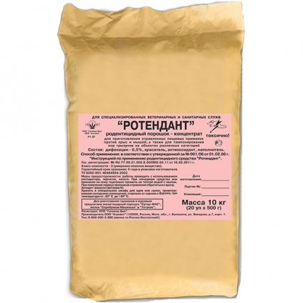 Родентицидное средство «Ротендант» представляет собой концентрат в форме порошка розового цвета, содержащий в качестве действующего вещества 0,50% дифенацина. Приманки, приготовленные на основе средства «Ротендант», эффективны в отношении серых, черных крыс и домовых мышей. Поедаемость приманок составляет 15% и 35 % суточного рациона крыс и мышей, гибель грызунов составляет более 80% в течение 7 -11 суток. Средство также эффективно для борьбы с крысами при тампонировании их нор. Средство предназначено для приготовления профессиональным конгингентом отравленных приманок с целью борьбы с серыми, черными крысами и домовыми мышами, а также для тампонирования нор крыс в помещениях с последующей их заделкой. Приманки на основе "Ротенданта" применяются на объектах и помещениях различного типа и назначения, а также на не застроенной территории. Запрещается тампонирование нор в жилых помещениях, в местах приготовления и хранения пищи и в местах пребывания детей.