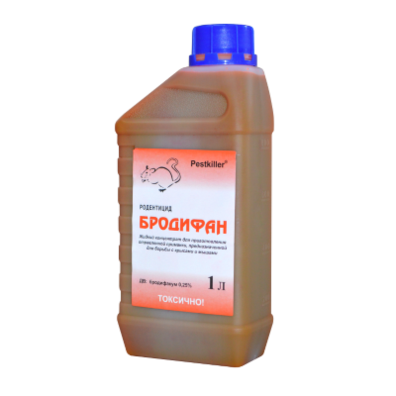 Средство “Бродифан” представляет собой жидкость красного цвета, содержащая в качестве ДВ - бродифакум (0,25%). Испытания биологической активности показали следующие результаты - 100 % гибель серых крыс и домовых мышей (при альтернативном кормлении). Средство “Бродифан” предназначено для приготовления отравленных приманок и их применения с целью уничтожения крыс и мышей профессиональным контингентом. Приманки применяются на застроенных территориях населённых пунктов, включая жилые помещения, пищевые и лечебные объекты (в недоступных для детей местах), а также детские в отсутствие детей.