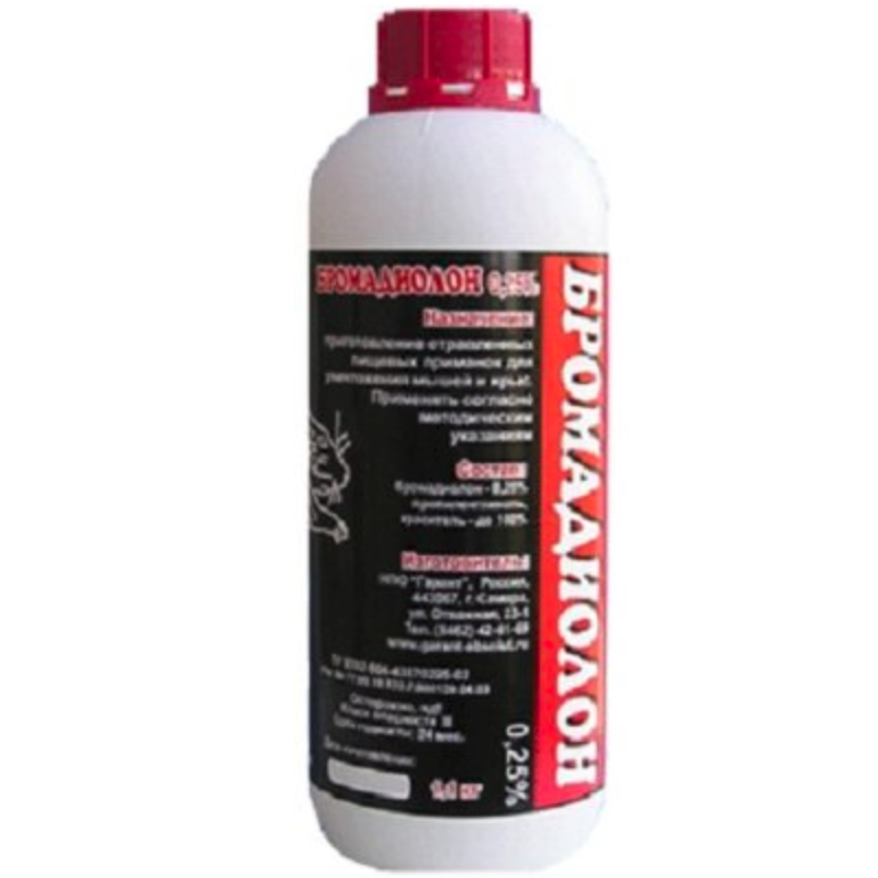 Родентнцидное средство "Бромадиолон-0,25%" представляет собой вязкую прозрачную жидкость красного цвета, содержащую в качестве действующего вещества (ДВ) бромадиолон - 0,25%. В его состав входит также битрекс (горький компонент), предохраняющий приманки на основе "Бромадиолон-0,25%" от поедания птицами и снижающий опасность случайного отравления людей и нецелевых видов животных. Цвет средства определяется наличием красителя красного.