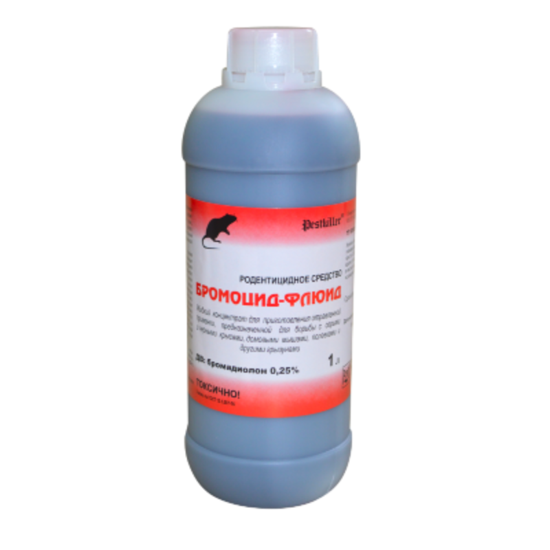 Средство родентицидное «БРОМОЦИД-ФЛЮИД» (далее - средство) представляет собой концентрат для приготовления отравленных приманок в виде подвижной жидкости красного или иного манифестного цвета. Средство содержит в качестве действующего вещества (ДВ) - бромадиолон (антикоагулянт второго поколения) - 0,25%, а так же растворитель, краситель и горечь - битрекс, необходимые для предотвращения случайного отравления людей и домашних животных. Приготовленные на основе средства «БРОМОЦИД-ФЛЮИД» пищевые приманки с содержанием бромадиолона 0,005%, обладают высокой родентицидной активностью в отношении крыс и мышей. Симптомы отравления типичны для антикоагулянтов. Гибель серых крыс наступает на 4-14 сутки после поедания приманки, мышей – на 4-10 сутки после поедания. Средство предназначено для борьбы с серыми и черными крысами, домовыми мышами, полевками, другими грызунами профессиональным контингентом в практике медицинской дератизации.Приманки на основе средства применяют на застроенных и не застроенных территориях населенных пунктов на объектах различных категорий, в том числе промышленных, пищевых, в жилых помещениях, детских (в недоступных детям местах или в их отсутствие, за исключением спален и игровых комнат) и лечебно-профилактических учреждениях (в том числе в палатах ЛПУ в периоды отсутствия больных), на складах хранения сельскохозяйственной продукции, а так же в очагах природно-очаговых инфекций.