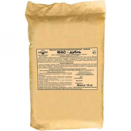 Инсектицидное средство "ФАС-дубль" представляет собой дуст от светло-серого до светло-коричневого цвета, содержащий в качестве действующего вещества зета-циперметрин в количестве 0,02% и эс-фенвалерат - 0,01%. Выпускается в упаковках из двойного полиэтилена по 50-300 г для быта и по 5-10-20 кг в крафт-мешках для дезорганизации. Срок годности 2 года . Средство "ФАС-дубль" обладает острым инсектицидным действием в отношении тараканов, муравьев, клопов, блох и мух и остаточным действием в течение 6-8 недель. Средство "ФАС-дубль" предназначено для уничтожения тараканов, муравьев, клопов, блох, мух профессиональным контингентом в практике медицинской дезинсекции и населением в быту на объектах различных категорий.