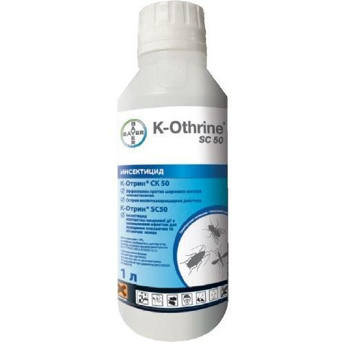 Средство инсектицидное «К-Отрин СК 50» представляет собой суспензионный концентрат в виде жидкости от белого до кремового цвета без запаха, содержащий в качестве действующего вещества (ДВ) синтетический пиретроид дельтаметрин (5%), а также антифриз, разбавитель, диспергатор и другие функциональные компоненты, Средство «К-Отрин СК 50» обладает острым инсектицидным действием в отношении синантропных тараканов, мух, блох, постельных клопов, домовых муравьев, комаров. Остаточная активность сохраняется до 10 недель. Средство «К-Отрин СК 50» предназначено для уничтожения синантропных тараканов, муравьев, клопов, блох, мух и комаров в практике медицинской дезинсекции на объектах различных категорий.